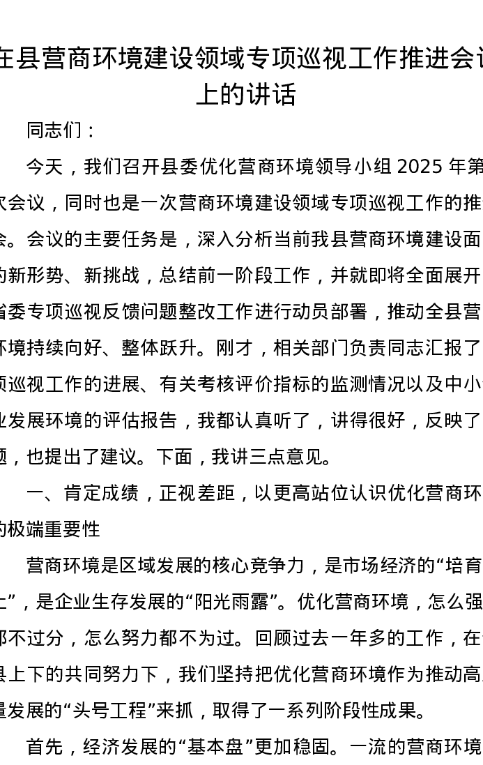 在县营商环境建设领域专项巡视工作推进会议上的讲话