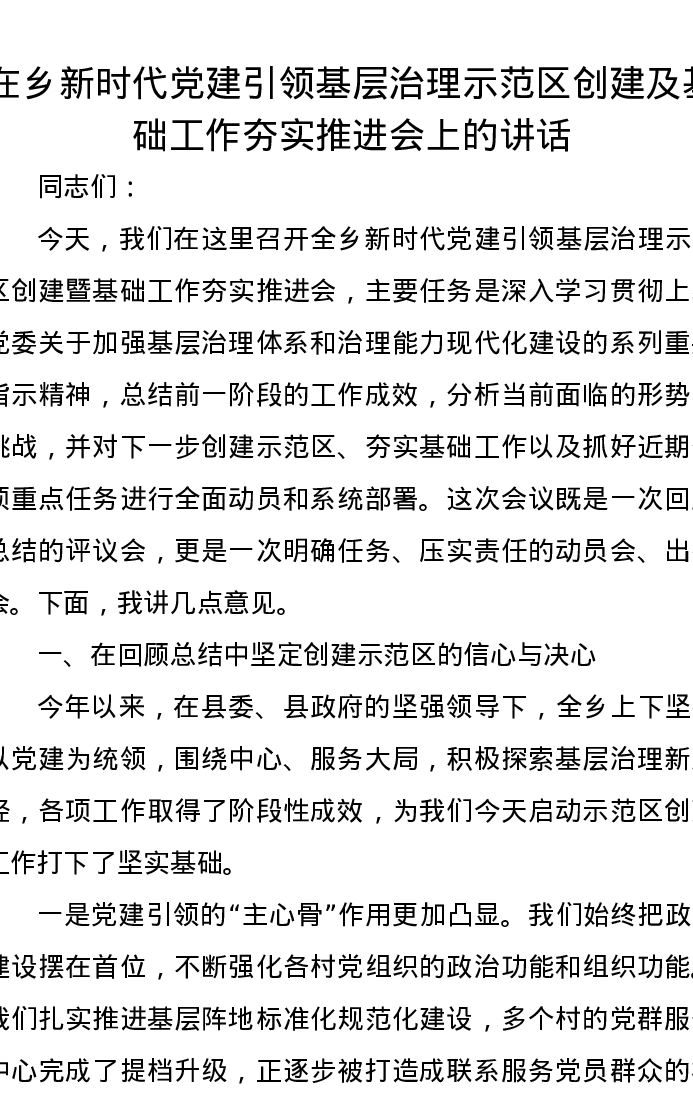 在乡新时代党建引领基层治理示范区创建及基础工作夯实推进会上的讲话