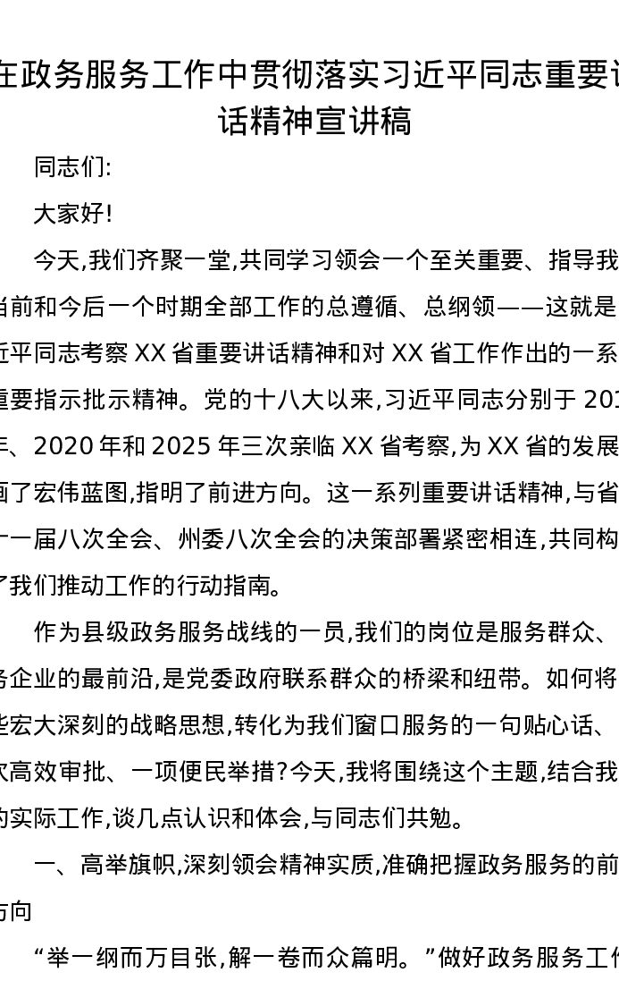 在政务服务工作中贯彻落实习近平总书记重要讲话精神宣讲稿