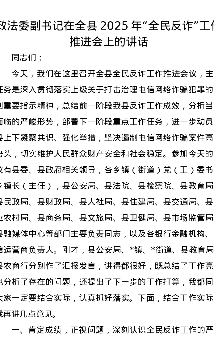 政法委副书记在全县2025年“全民反诈”工作推进会上的讲话