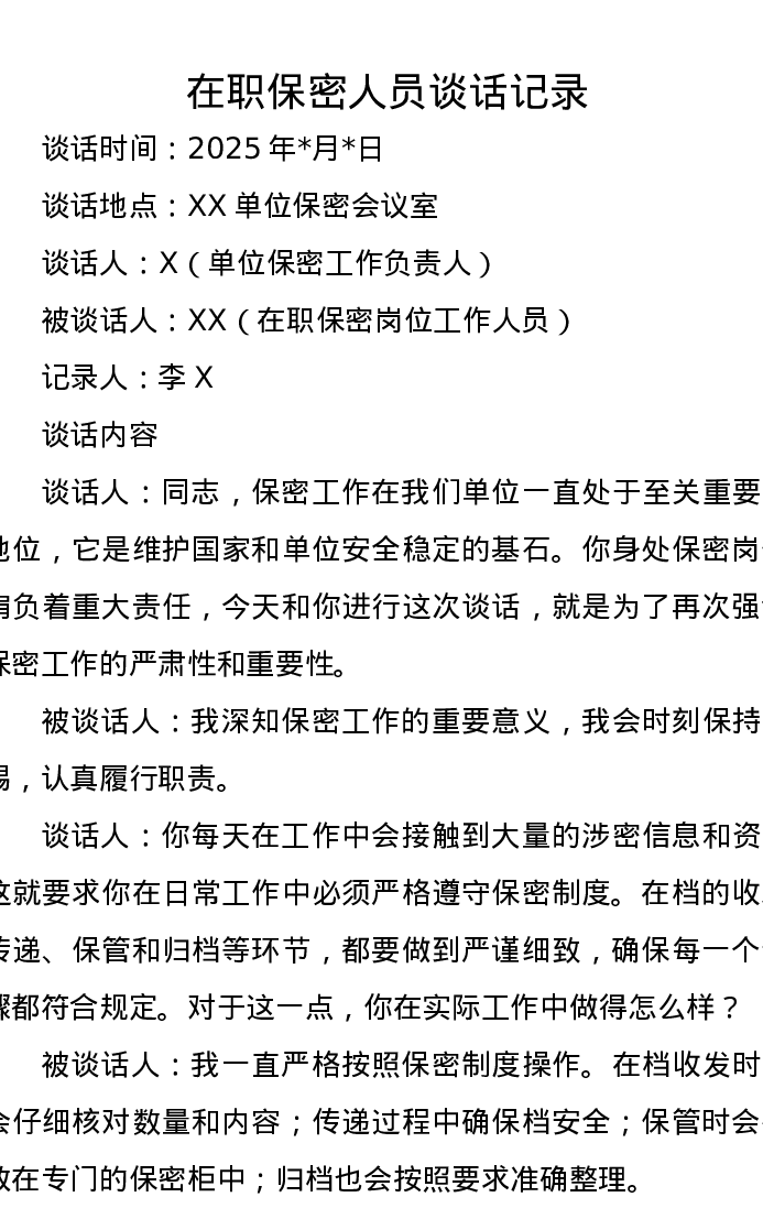 在职保密人员谈话记录