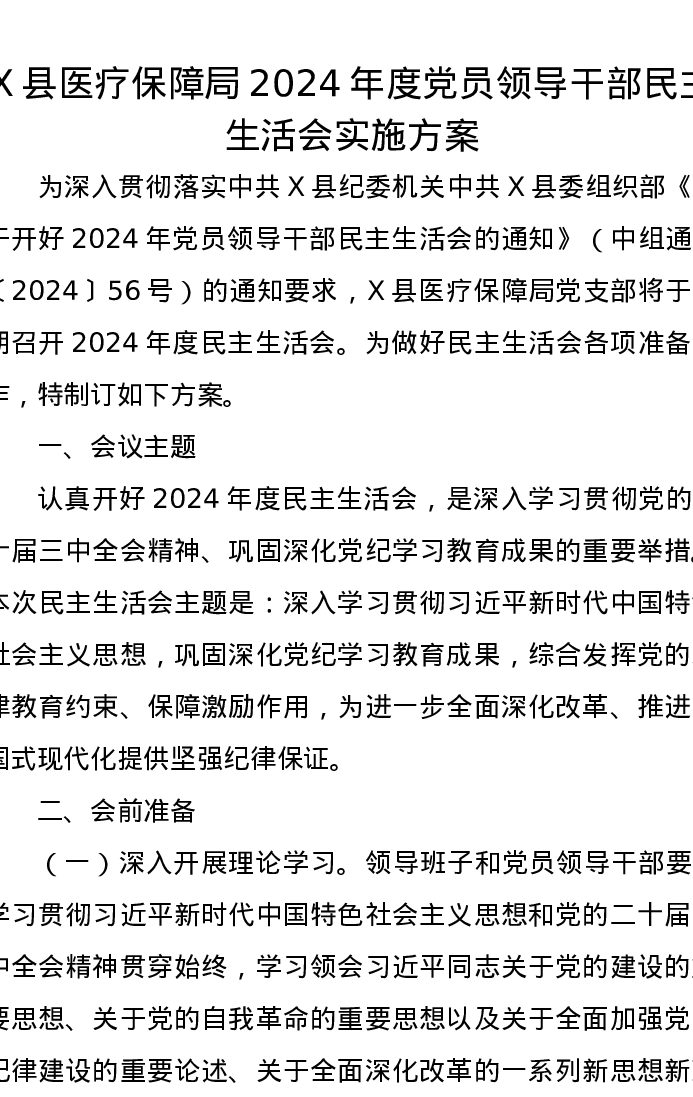 X县医疗保障局2024年度党员领导干部民主生活会实施方案