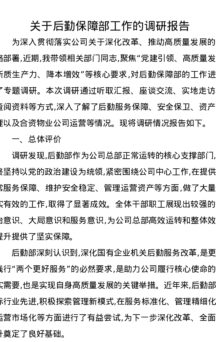 关于后勤保障部工作的调研报告