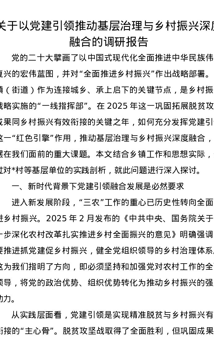 关于以党建引领推动基层治理与乡村振兴深度融合的调研报告