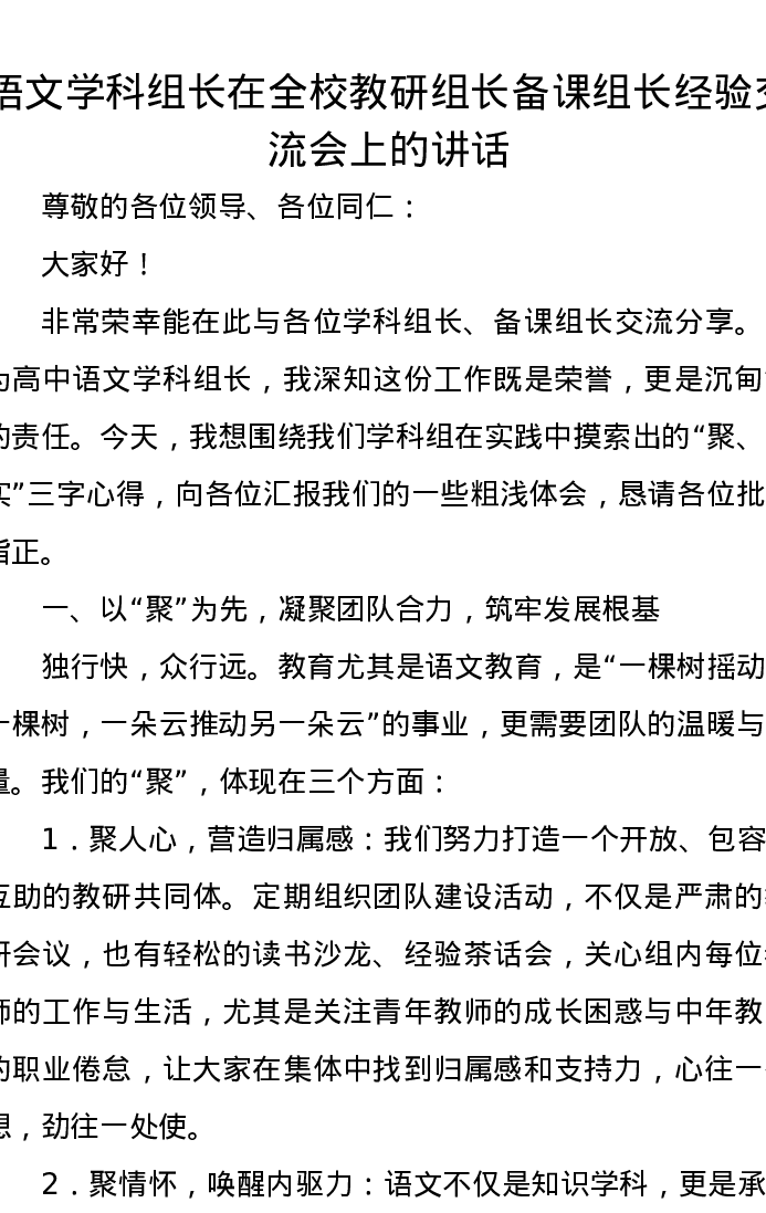 语文学科组长在全校教研组长备课组长经验交流会上的讲话