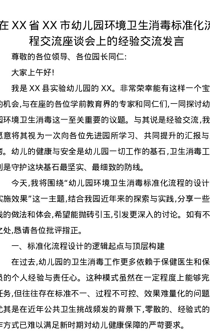 在XX省XX市幼儿园环境卫生消毒标准化流程交流座谈会上的经验交流发言