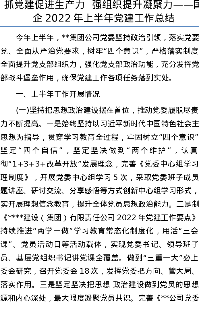 20220803抓党建促进生产力 强组织提升凝聚力——国企2022年上半年党建工作总结