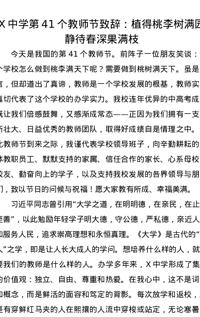 X中学第41个教师节致辞:植得桃李树满园静待春深果满枝