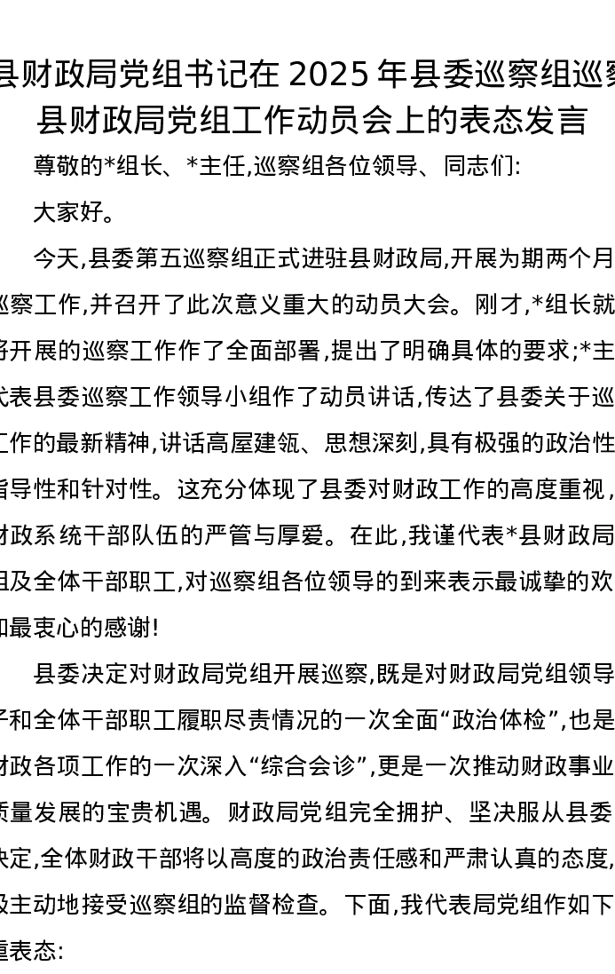 县财政局党组书记在2025年县委巡察组巡察县财政局党组工作动员会上的表态发言