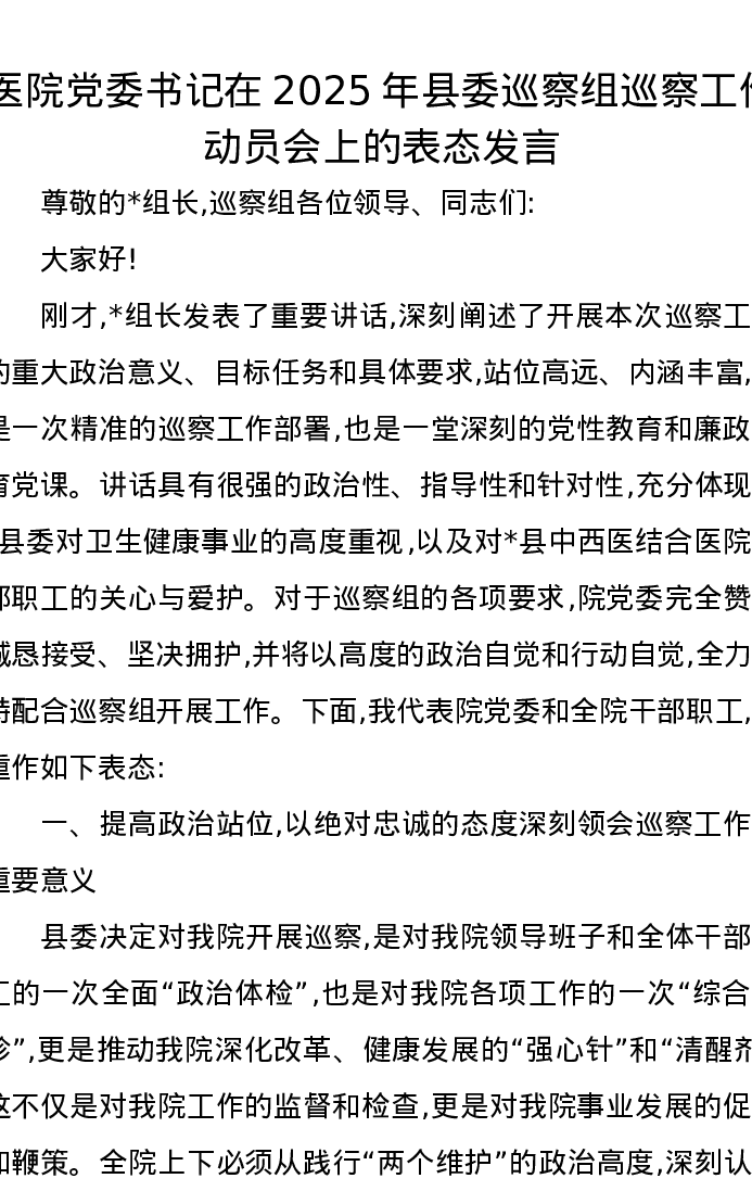 医院党委书记在2025年县委巡察组巡察工作动员会上的表态发言