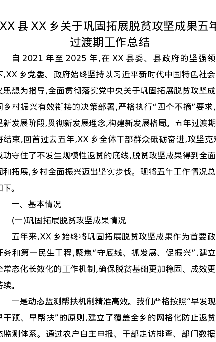 XX县XX乡关于巩固拓展脱贫攻坚成果五年过渡期工作总结
