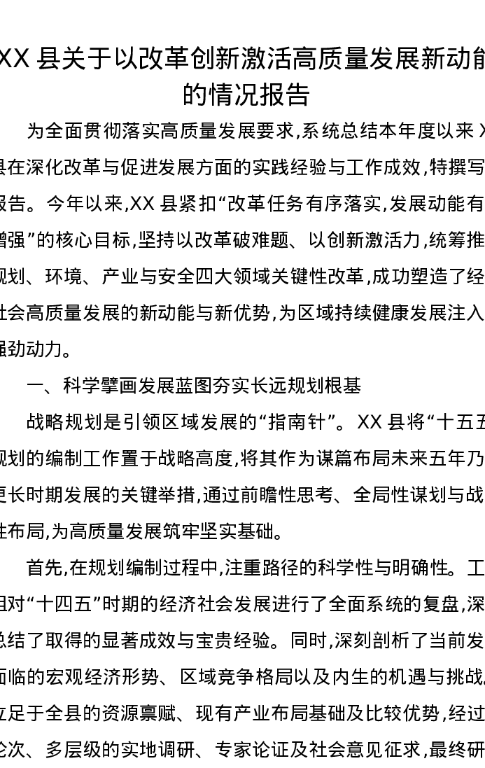 XX县关于以改革创新激活高质量发展新动能的情况报告