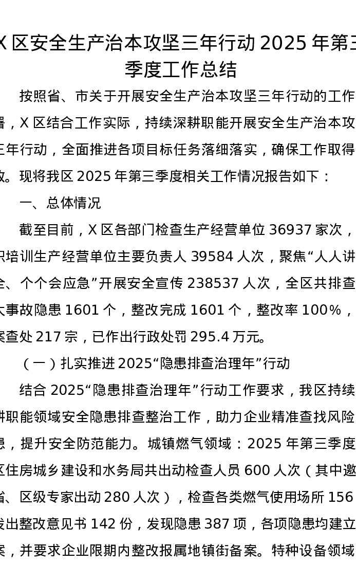 X区安全生产治本攻坚三年行动2025年第三季度工作总结