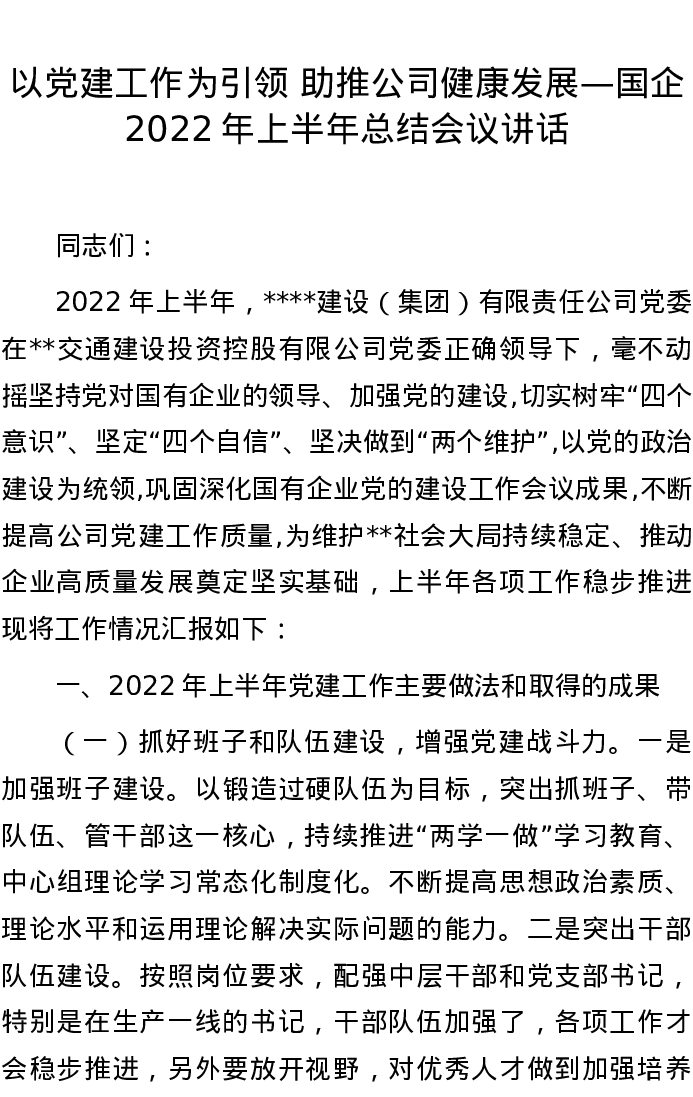 20220808以党建工作为引领 助推公司健康发展—国企2022年上半年总结会议讲话