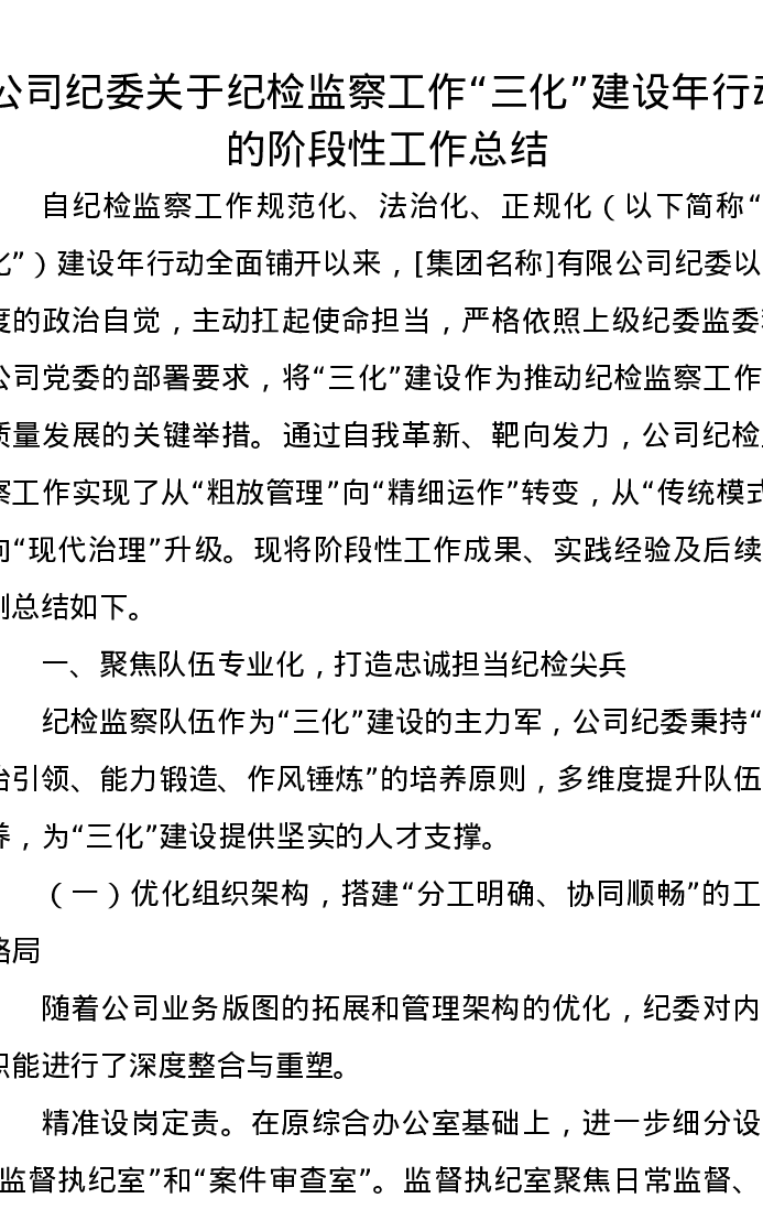 公司纪委关于纪检监察工作“三化”建设年行动的阶段性工作总结