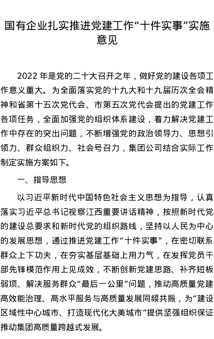 20220808国有企业扎实推进党建工作“十件实事”实施意见