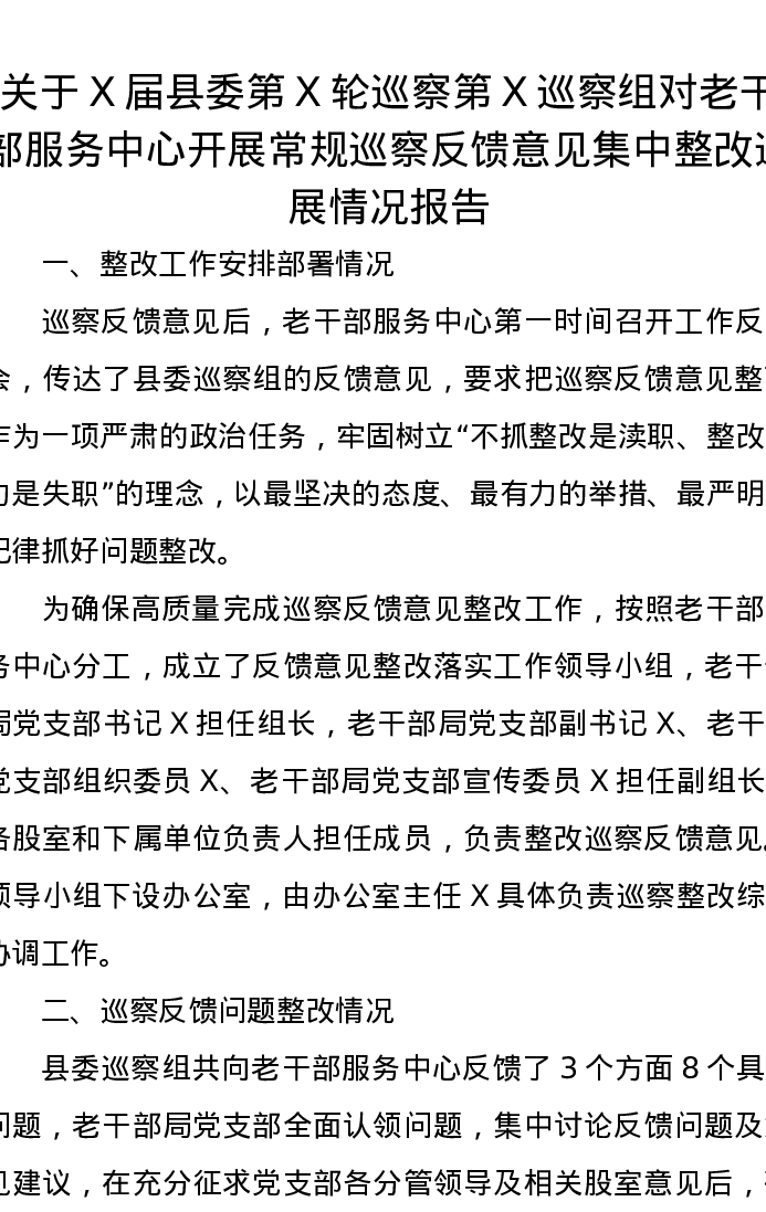 关于X届县委第X轮巡察第X巡察组对老干部服务中心开展常规巡察反馈意见集中整改进展情况报告