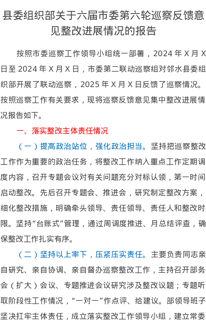 县委组织部关于六届市委第六轮巡察反馈意见整改进展情况的报告