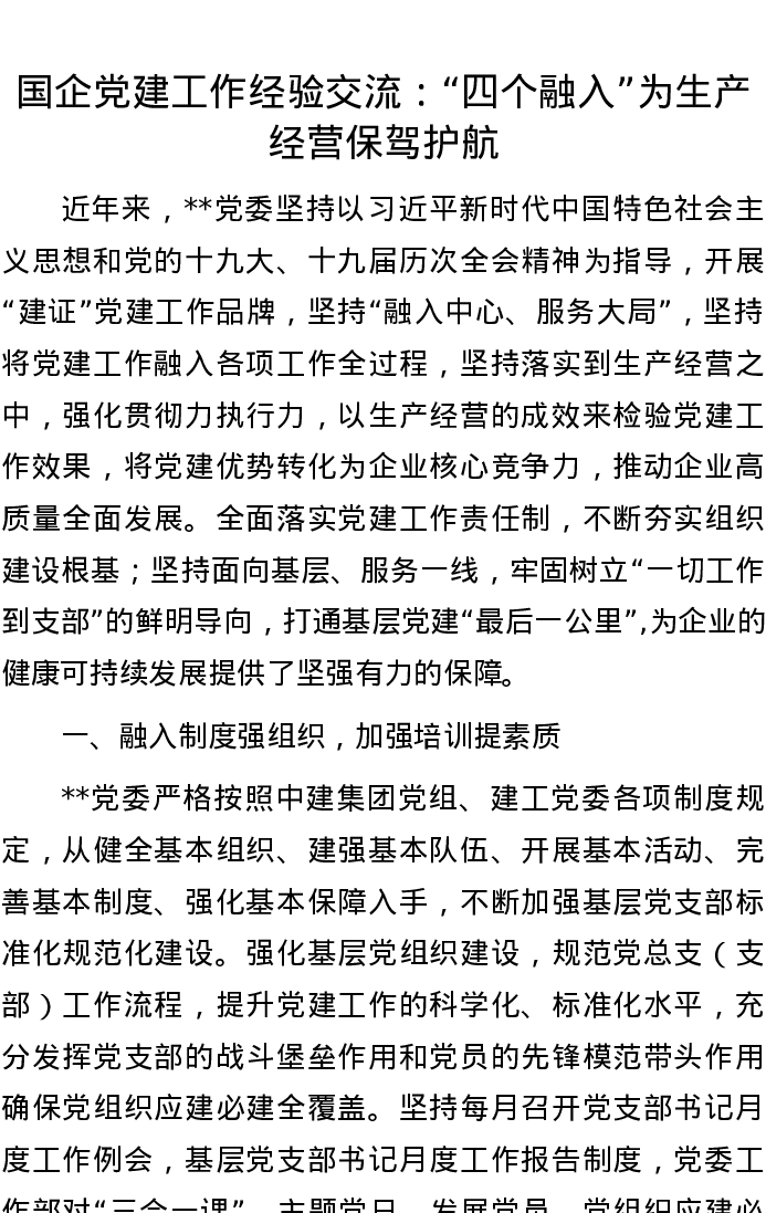 20220810国企党建工作经验交流:“四个融入”为生产经营保驾护航