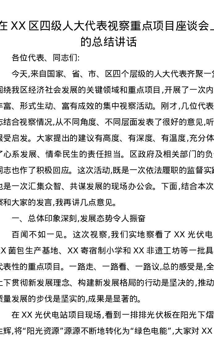 在XX区四级人大代表视察重点项目座谈会上的总结讲话