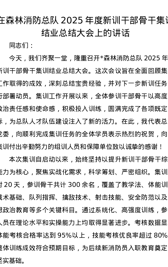 在森林消防总队2025年度新训干部骨干集训结业总结大会上的讲话