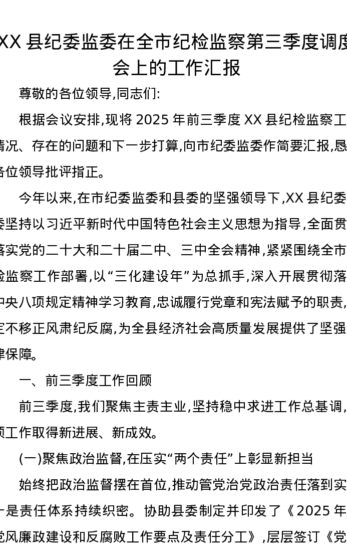 XX县纪委监委在全市纪检监察第三季度调度会上的工作汇报