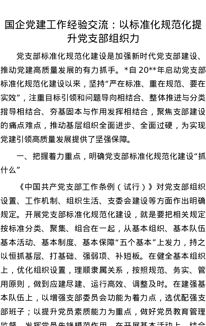 20220810国企党建工作经验交流:以标准化规范化提升党支部组织力
