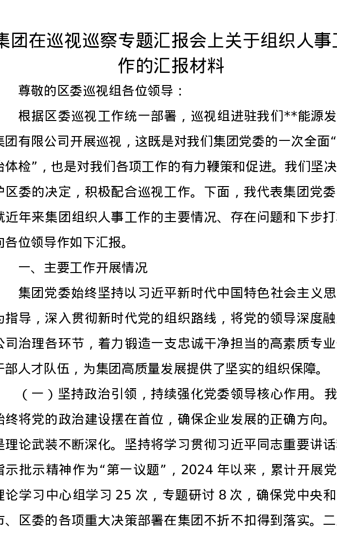 集团在巡视巡察专题汇报会上关于组织人事工作的汇报材料