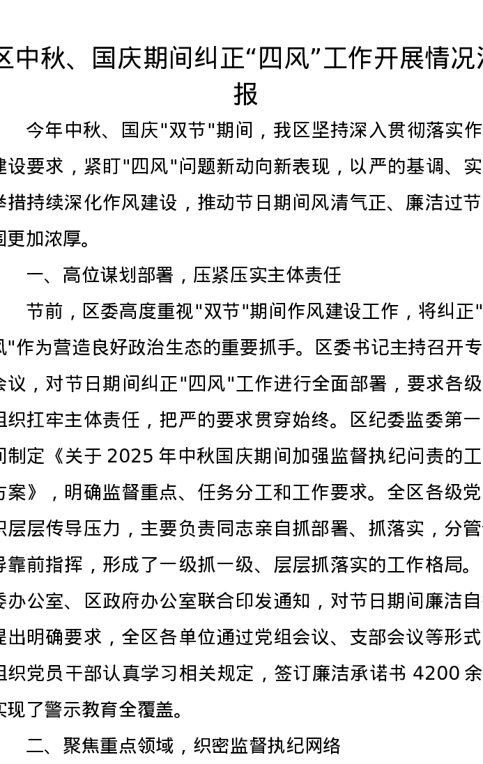 区中秋、国庆期间纠正“四风”工作开展情况汇报