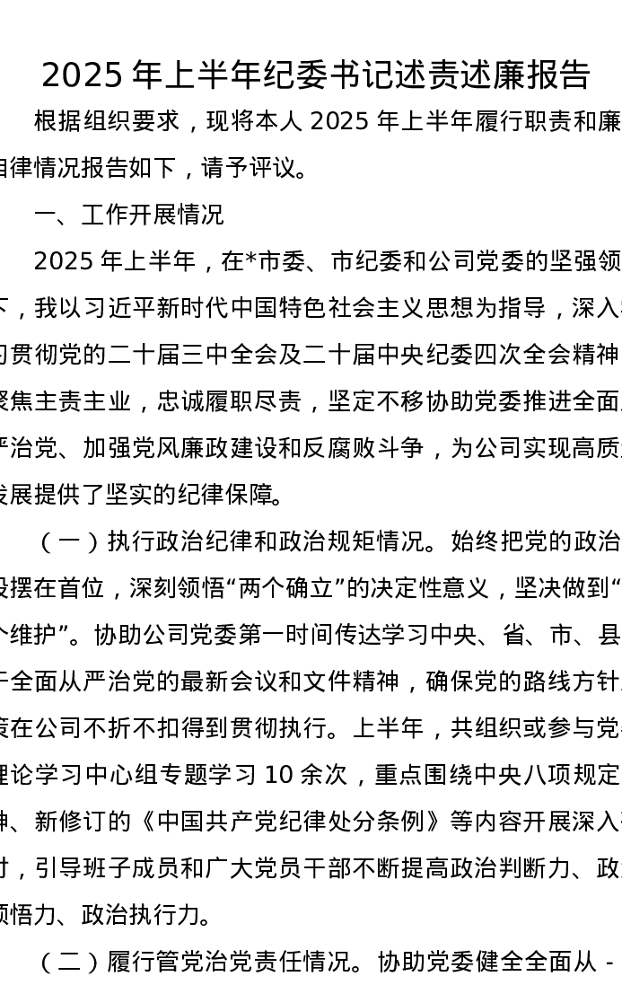 2025年上半年纪委书记述责述廉报告