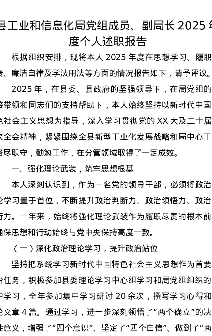 县工业和信息化局党组成员、副局长2025年度个人述职报告