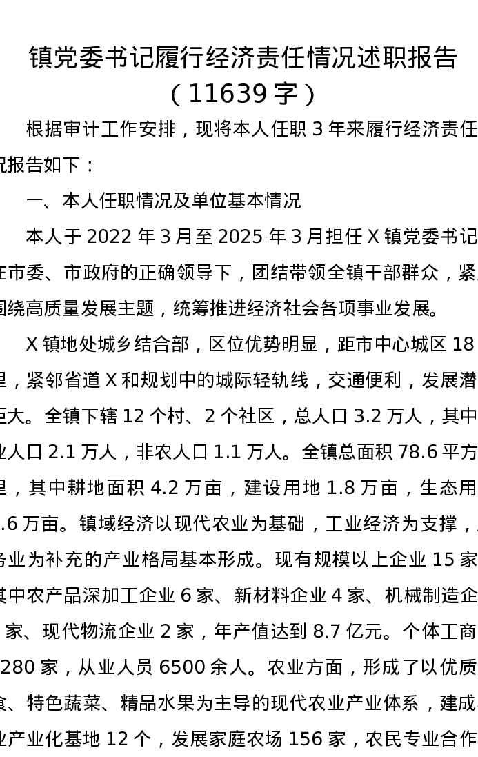 镇党委书记履行经济责任情况述职报告(11639字)