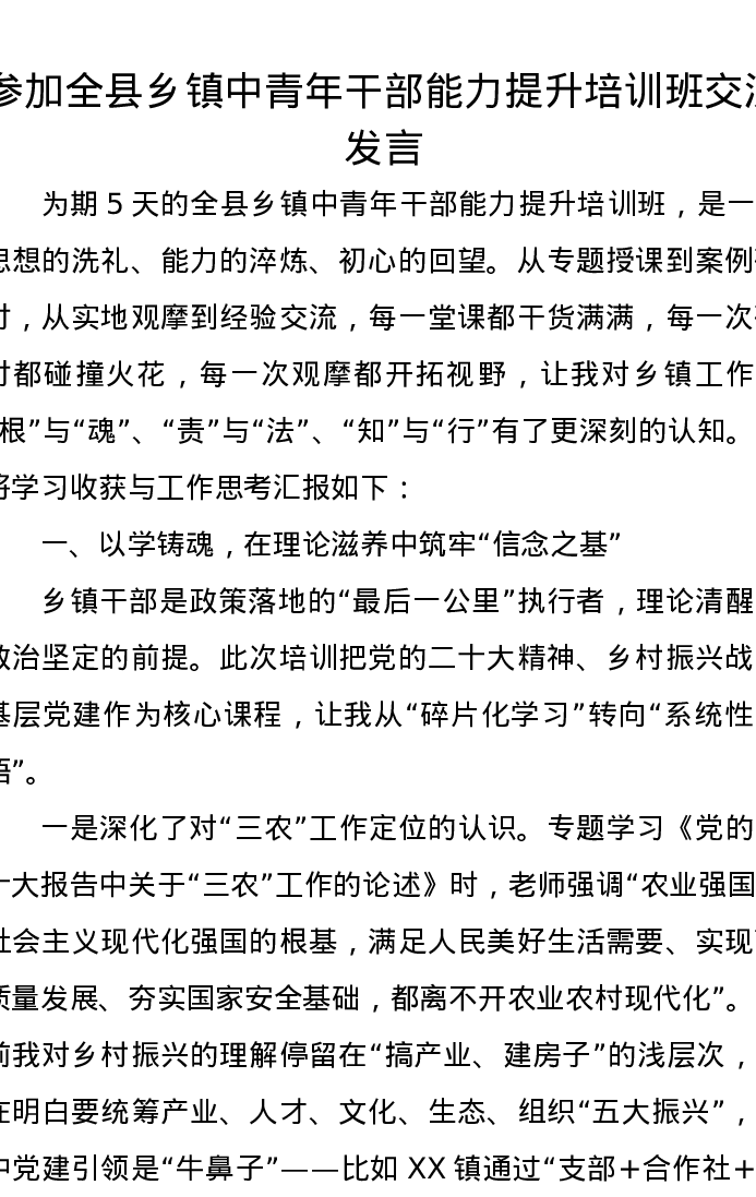 参加全县乡镇中青年干部能力提升培训班交流发言