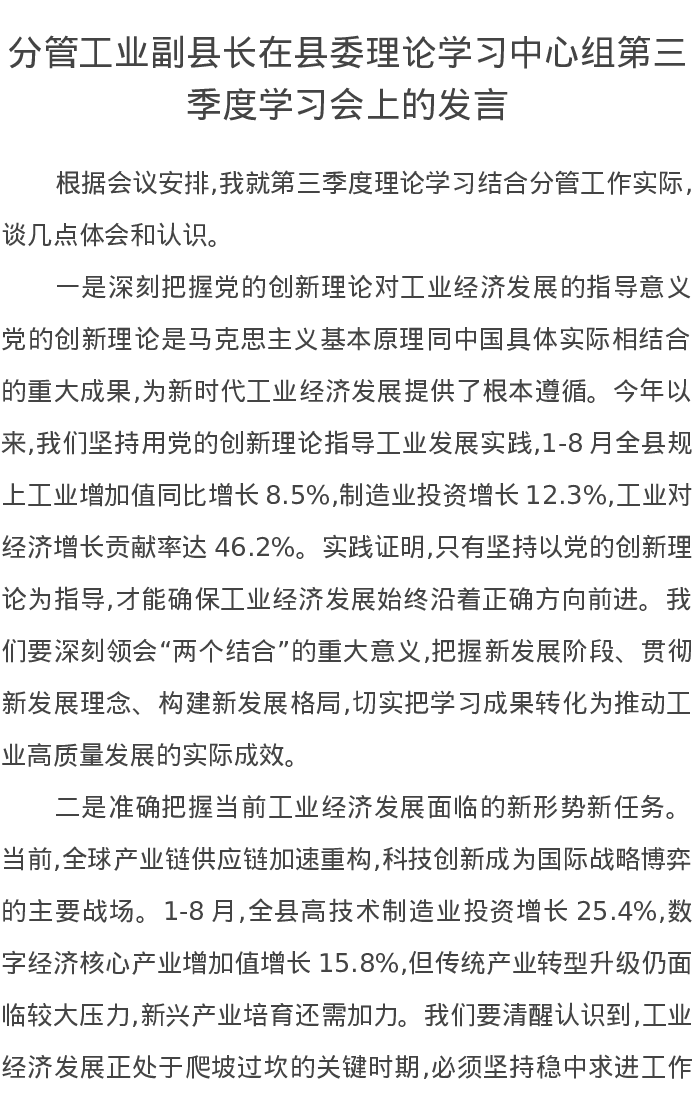 分管工业副县长在县委理论学习中心组第三季度学习会上的发言