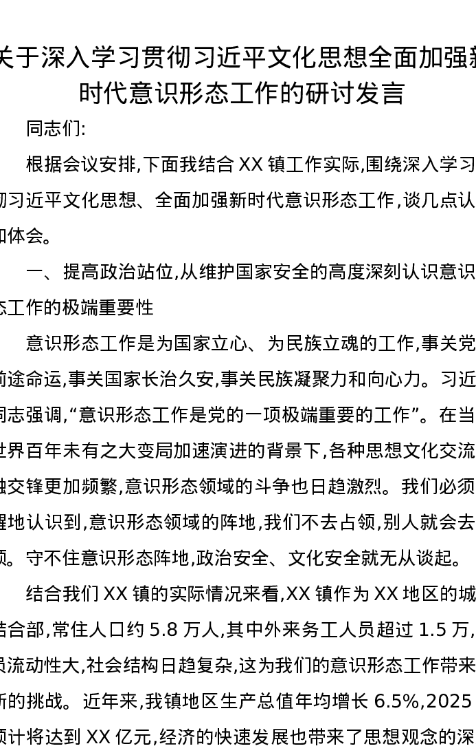 关于深入学习贯彻习近平文化思想全面加强新时代意识形态工作的研讨发言