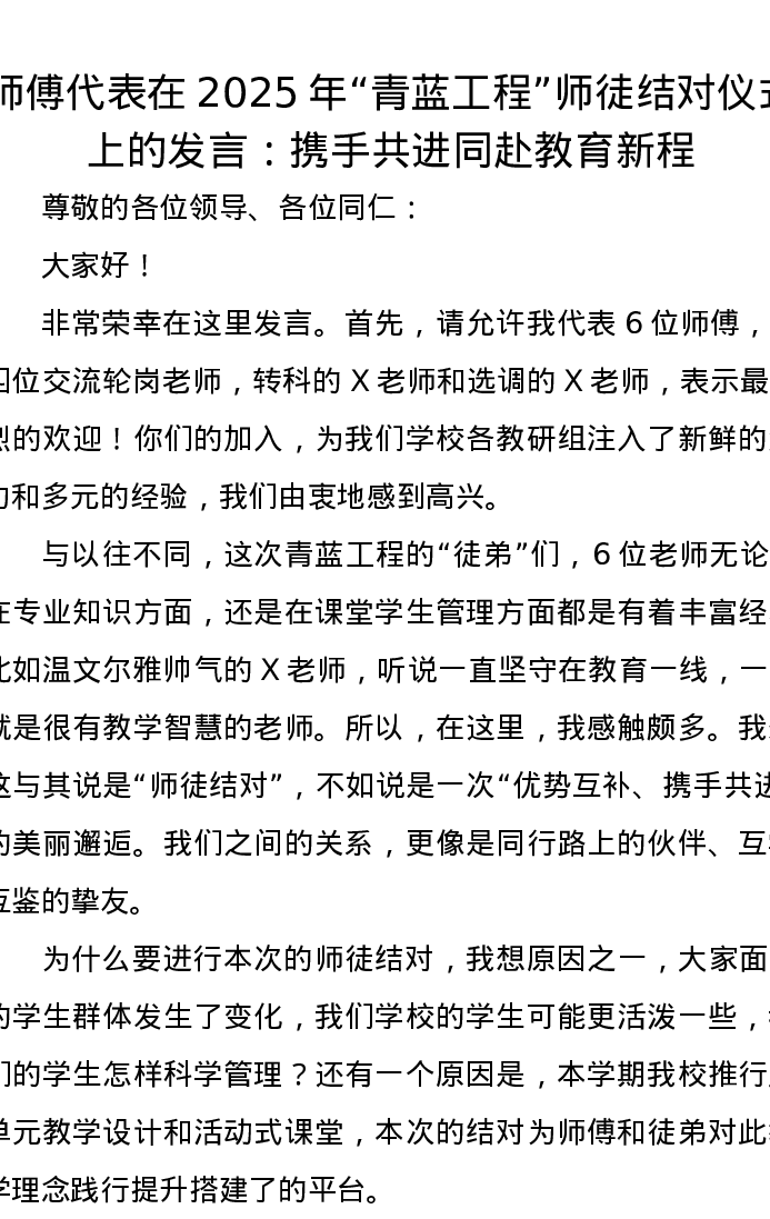师傅代表在2025年“青蓝工程”师徒结对仪式上的发言:携手共进同赴教育新程