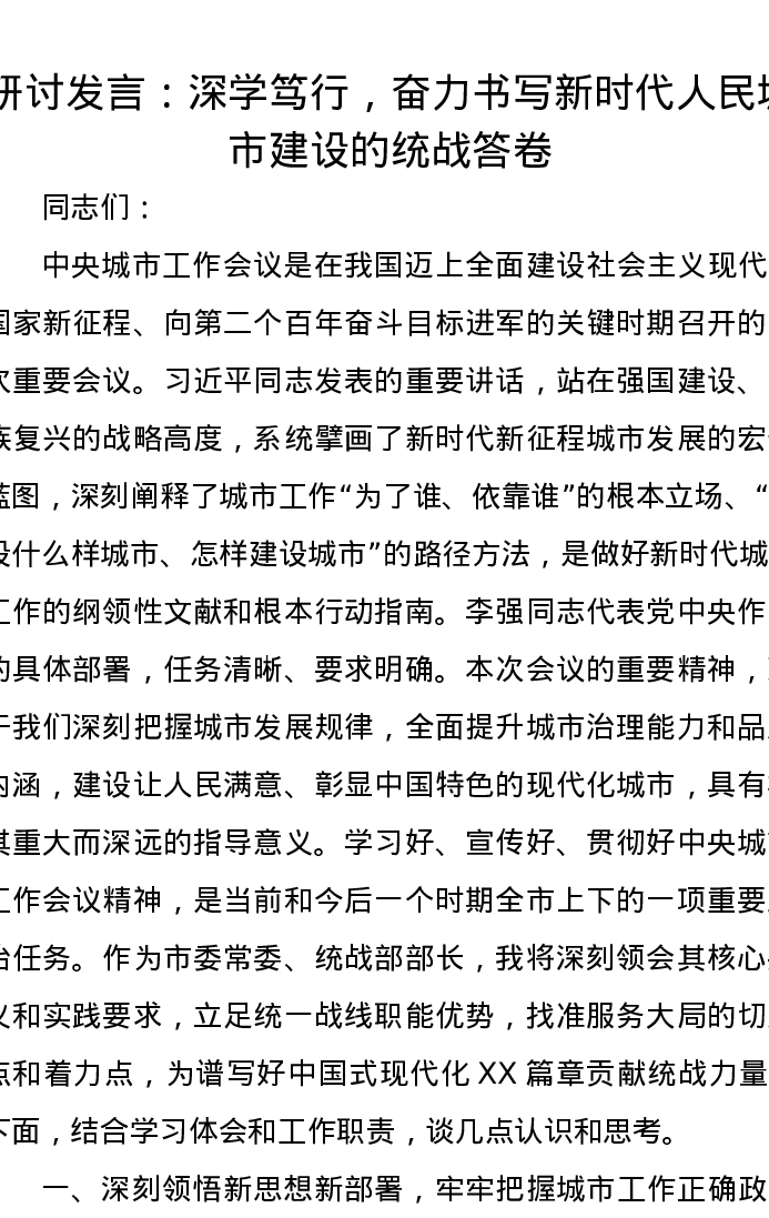 研讨发言:深学笃行,奋力书写新时代人民城市建设的统战答卷