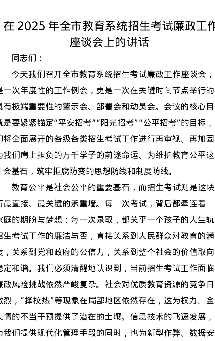 在2025年全市教育系统招生考试廉政工作座谈会上的讲话