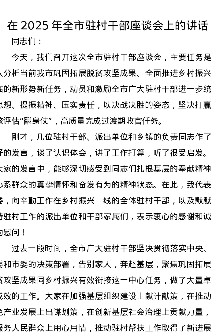 在2025年全市驻村干部座谈会上的讲话