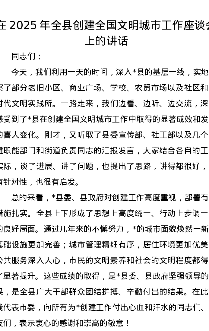 在2025年全县创建全国文明城市工作座谈会上的讲话