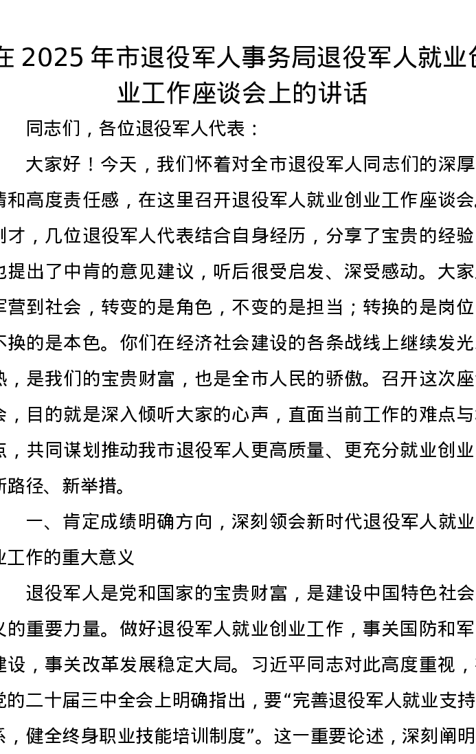 在2025年市退役军人事务局退役军人就业创业工作座谈会上的讲话