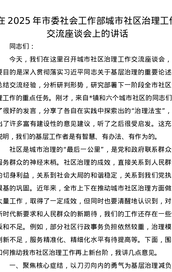 在2025年市委社会工作部城市社区治理工作交流座谈会上的讲话