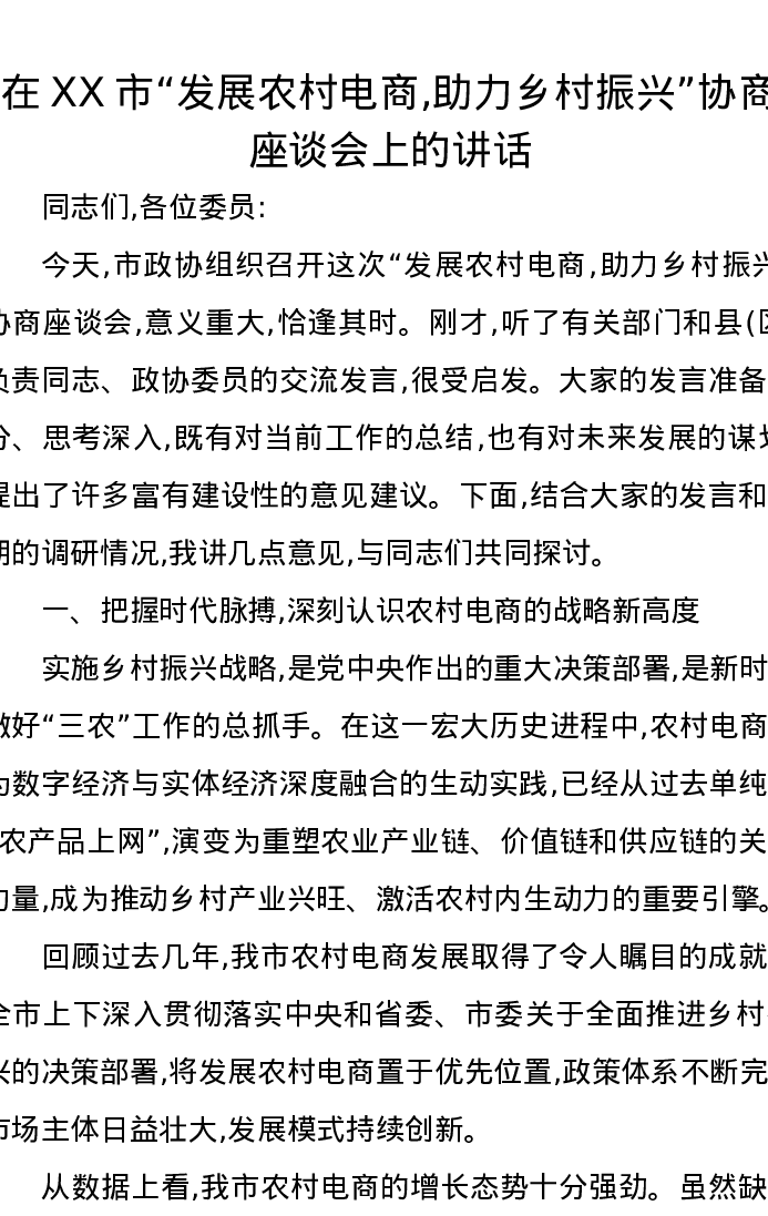 在XX市“发展农村电商,助力乡村振兴”协商座谈会上的讲话