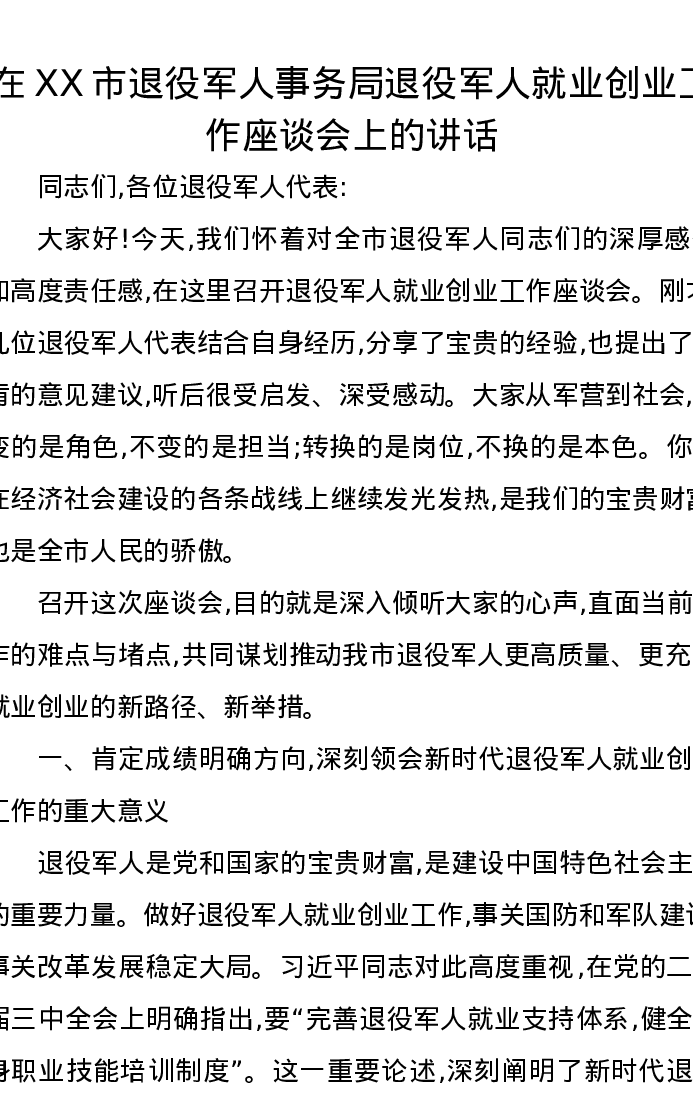 在XX市退役军人事务局退役军人就业创业工作座谈会上的讲话