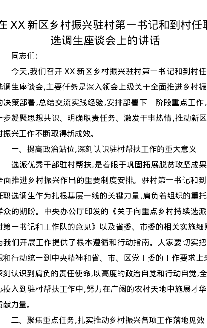 在XX新区乡村振兴驻村第一书记和到村任职选调生座谈会上的讲话