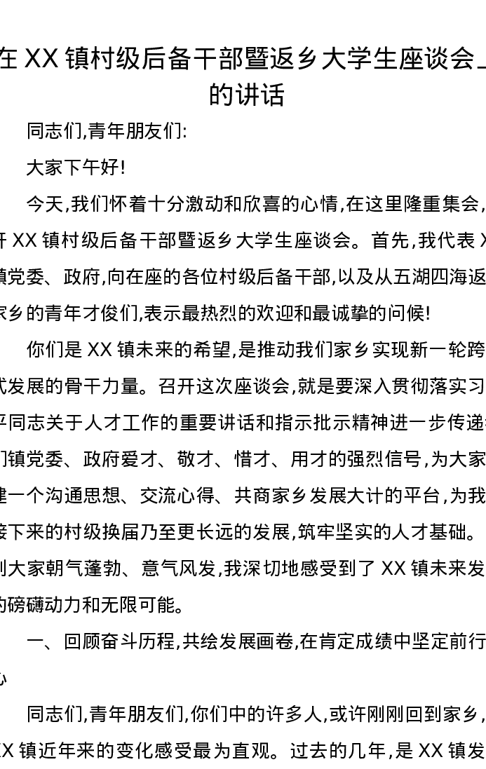 在XX镇村级后备干部暨返乡大学生座谈会上的讲话