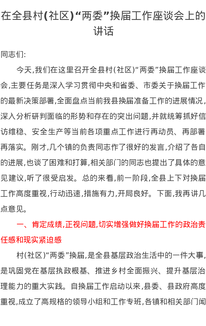 在全县村(社区)“两委”换届工作座谈会上的讲话