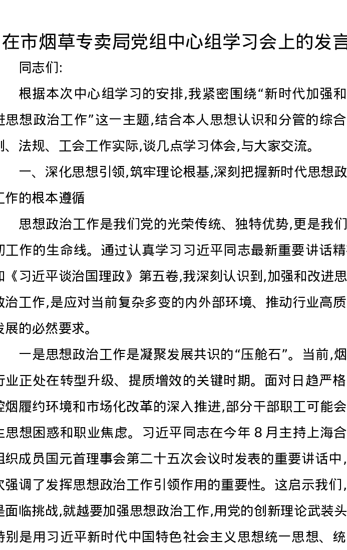 在市烟草专卖局党组中心组学习会上的发言