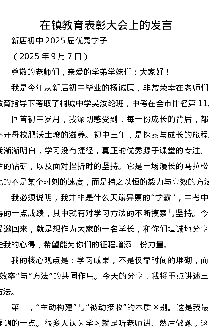 在镇教育表彰大会上的发言