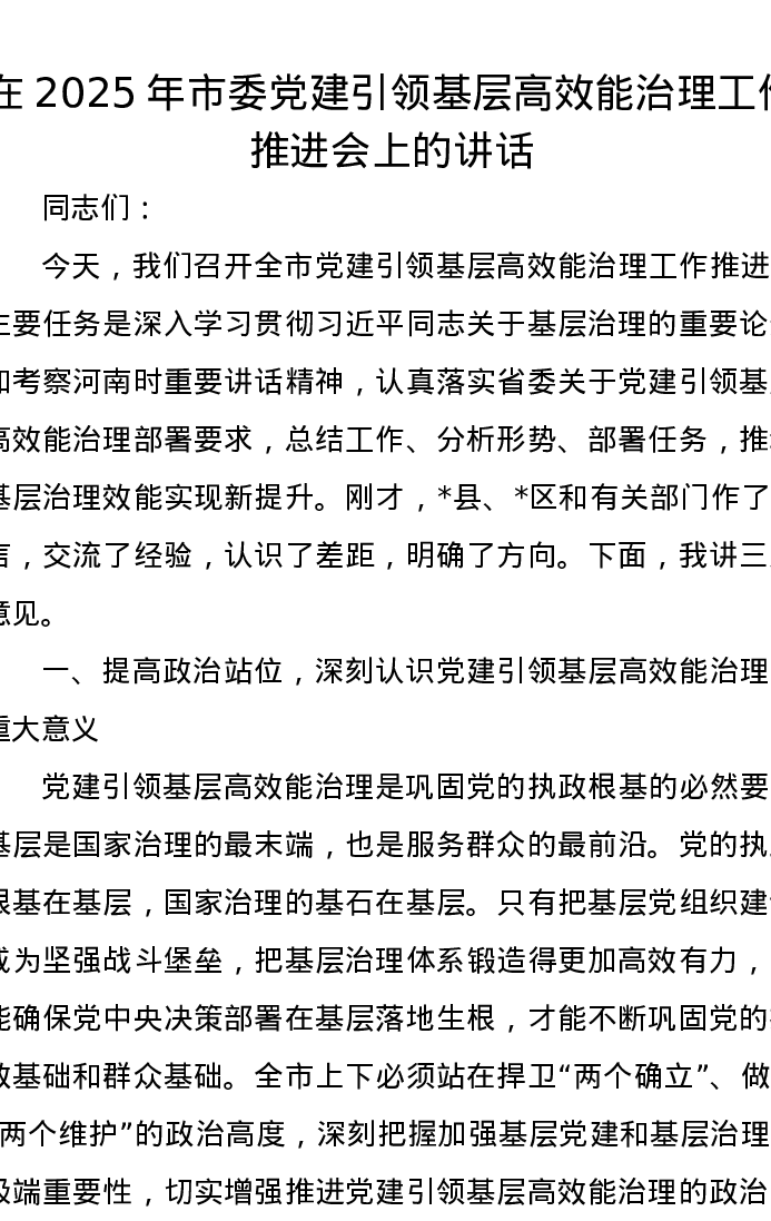 在2025年市委党建引领基层高效能治理工作推进会上的讲话
